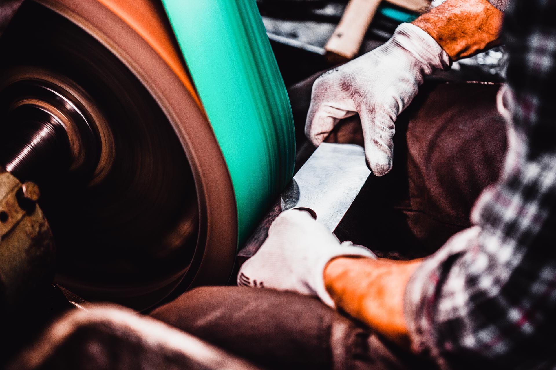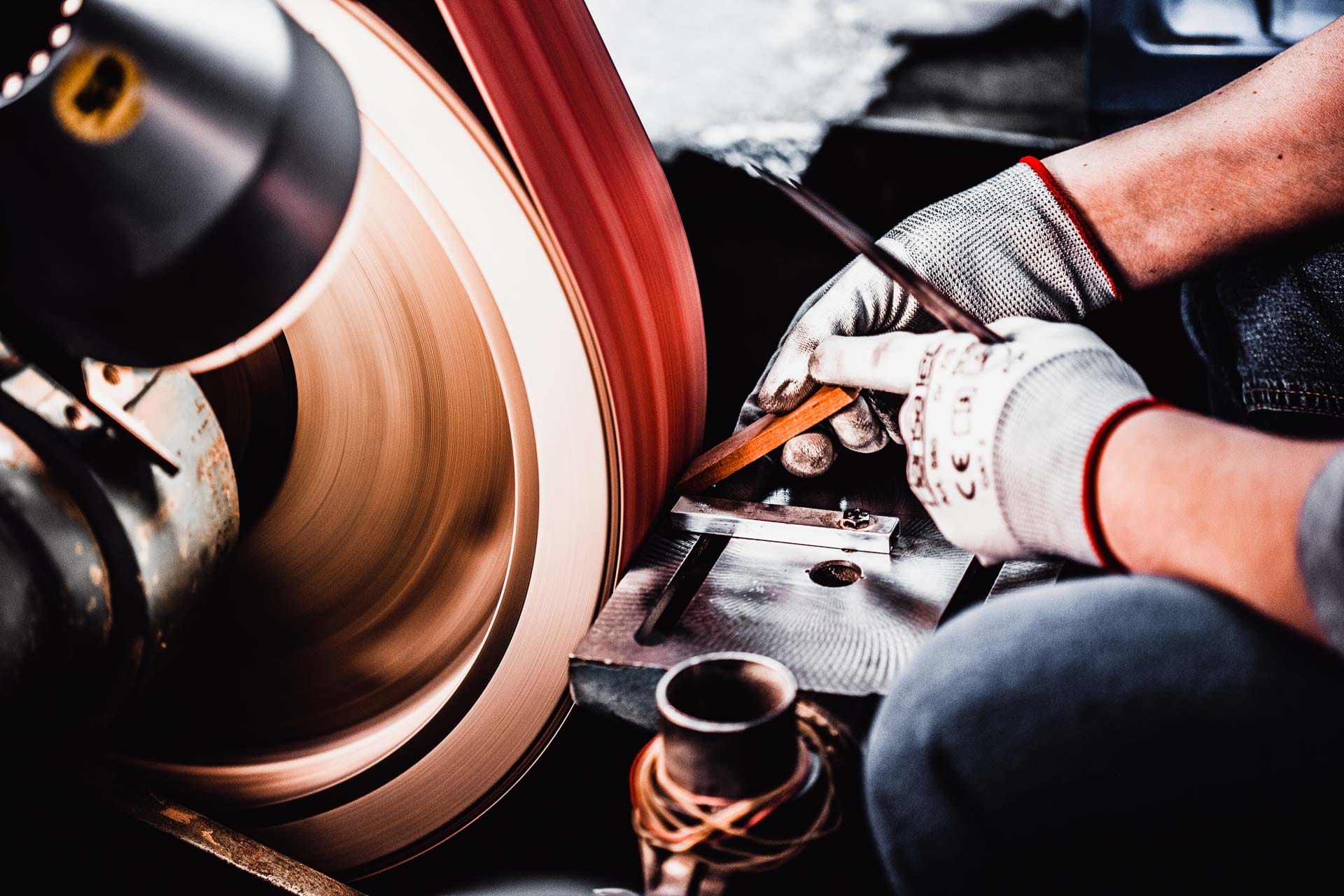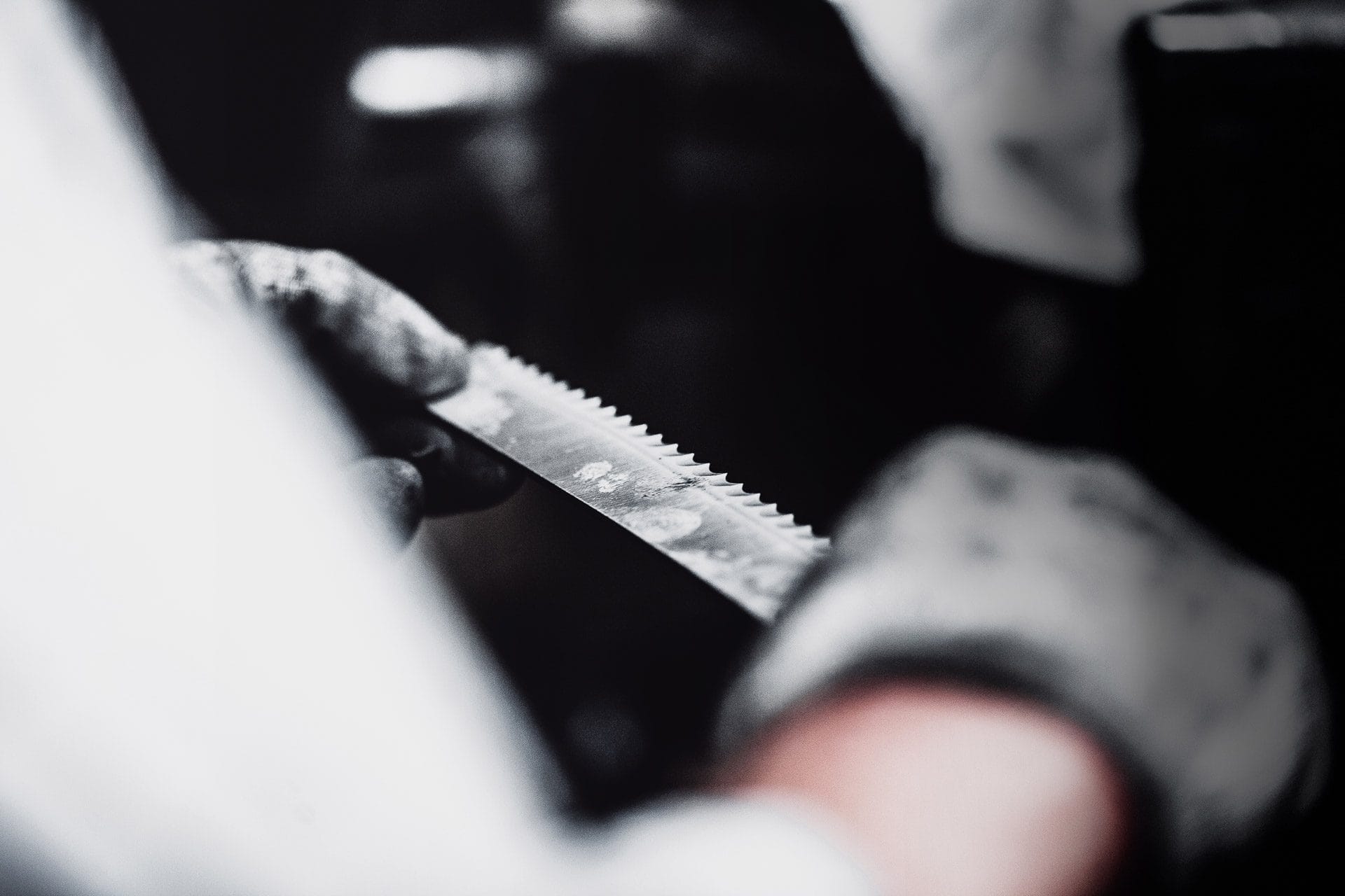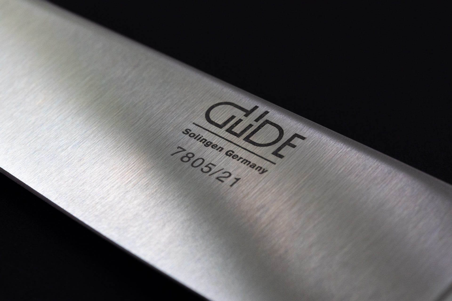 Jetzt bekommt der Messerrücken den Feinstschliff: Das Feinstschleifen des vorderen Kropfes erfolgt und die Messergriffe werden vorpoliert (gescheuert). Anschließend wird die mittlere Schmuckniete montiert und die Griffe werden feinpoliert. Daraufhin wird die Messerschneide geschliffen (abgezogen) und der Abzug poliert. Im nächsten Schritt wird das GÜDE Logo auf die Klinge geätzt.