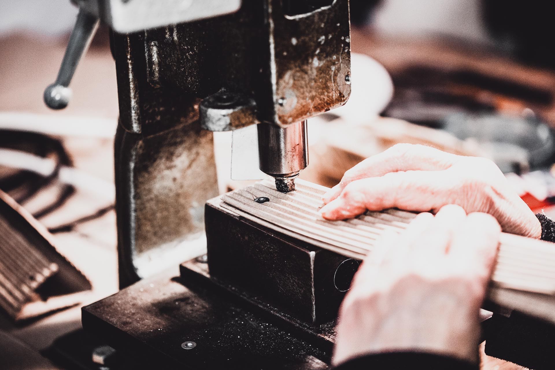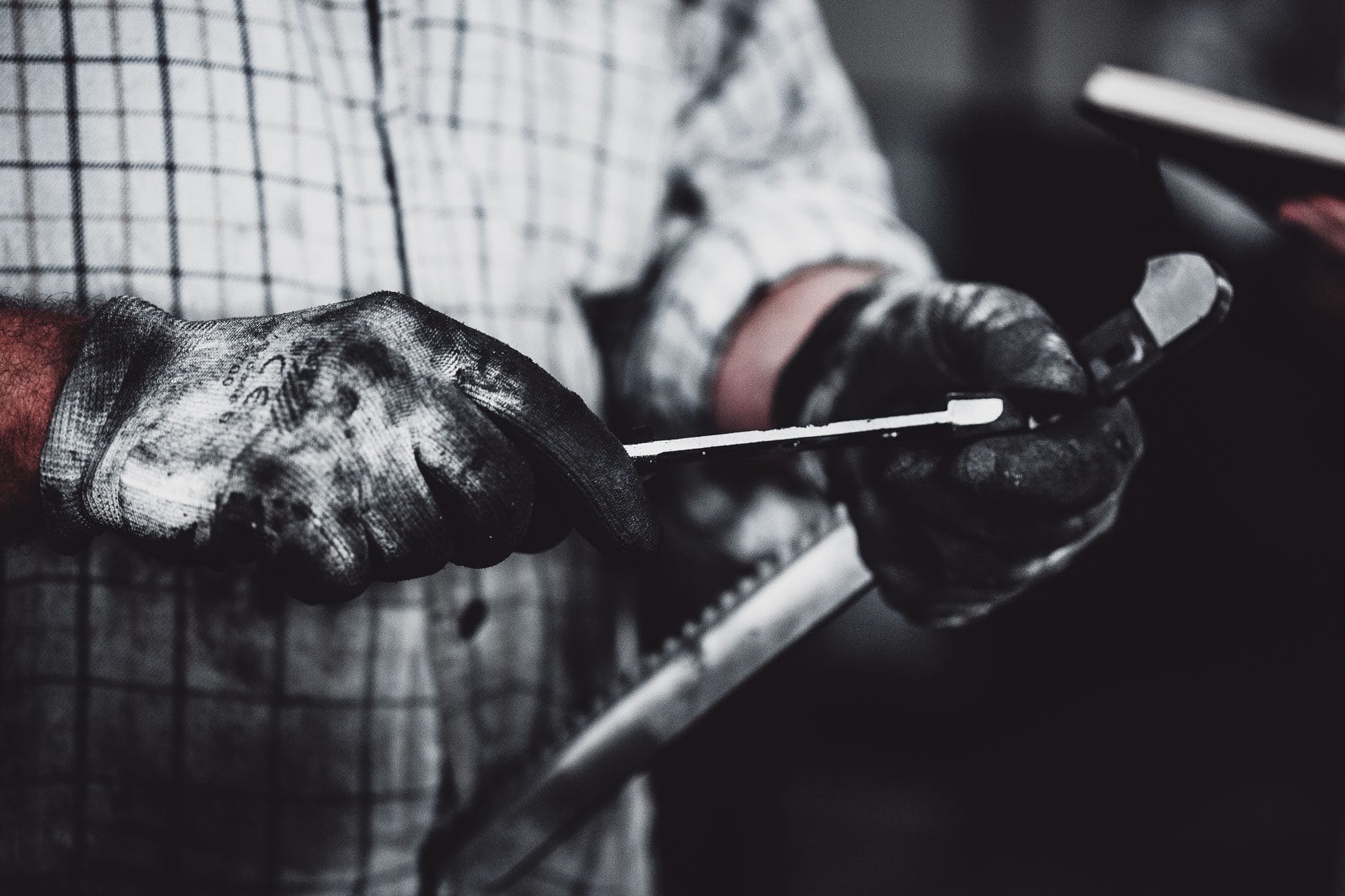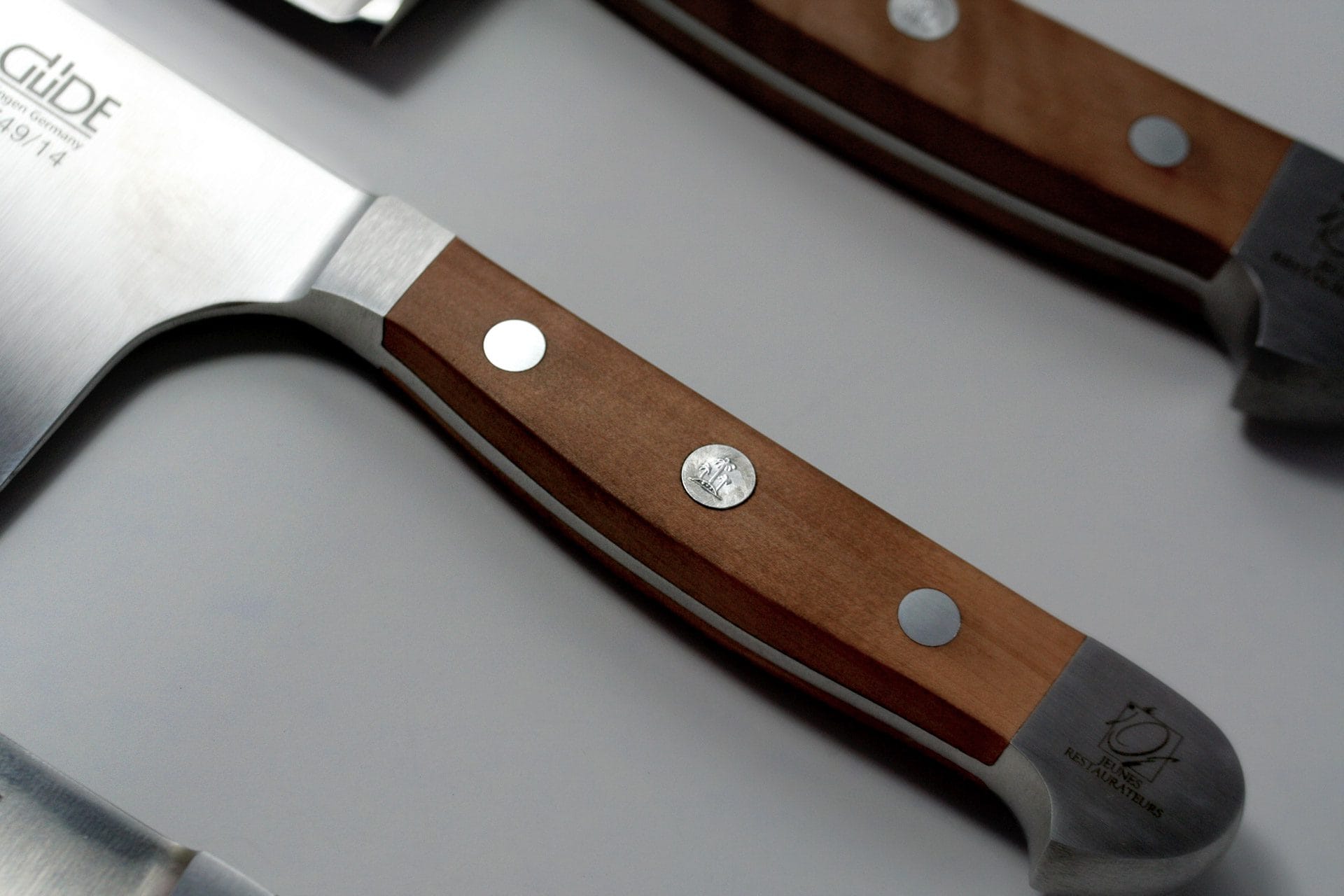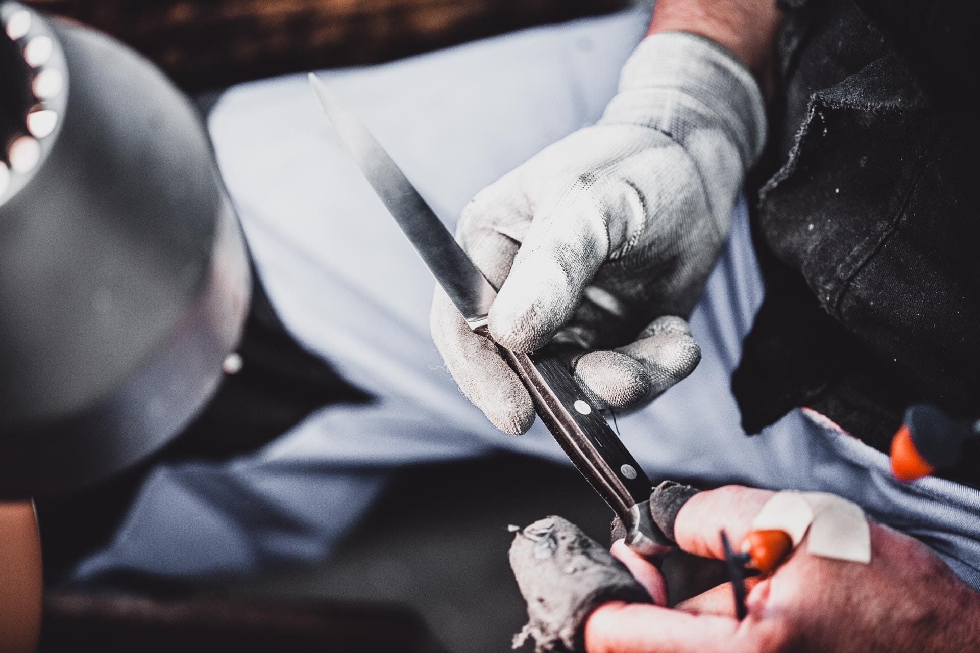 Jetzt bekommt der Messerrücken den Feinstschliff: Das Feinstschleifen des vorderen Kropfes erfolgt und die Messergriffe werden vorpoliert (gescheuert). Anschließend wird die mittlere Schmuckniete montiert und die Griffe werden feinpoliert. Daraufhin wird die Messerschneide geschliffen (abgezogen) und der Abzug poliert. Im nächsten Schritt wird das GÜDE Logo auf die Klinge geätzt.