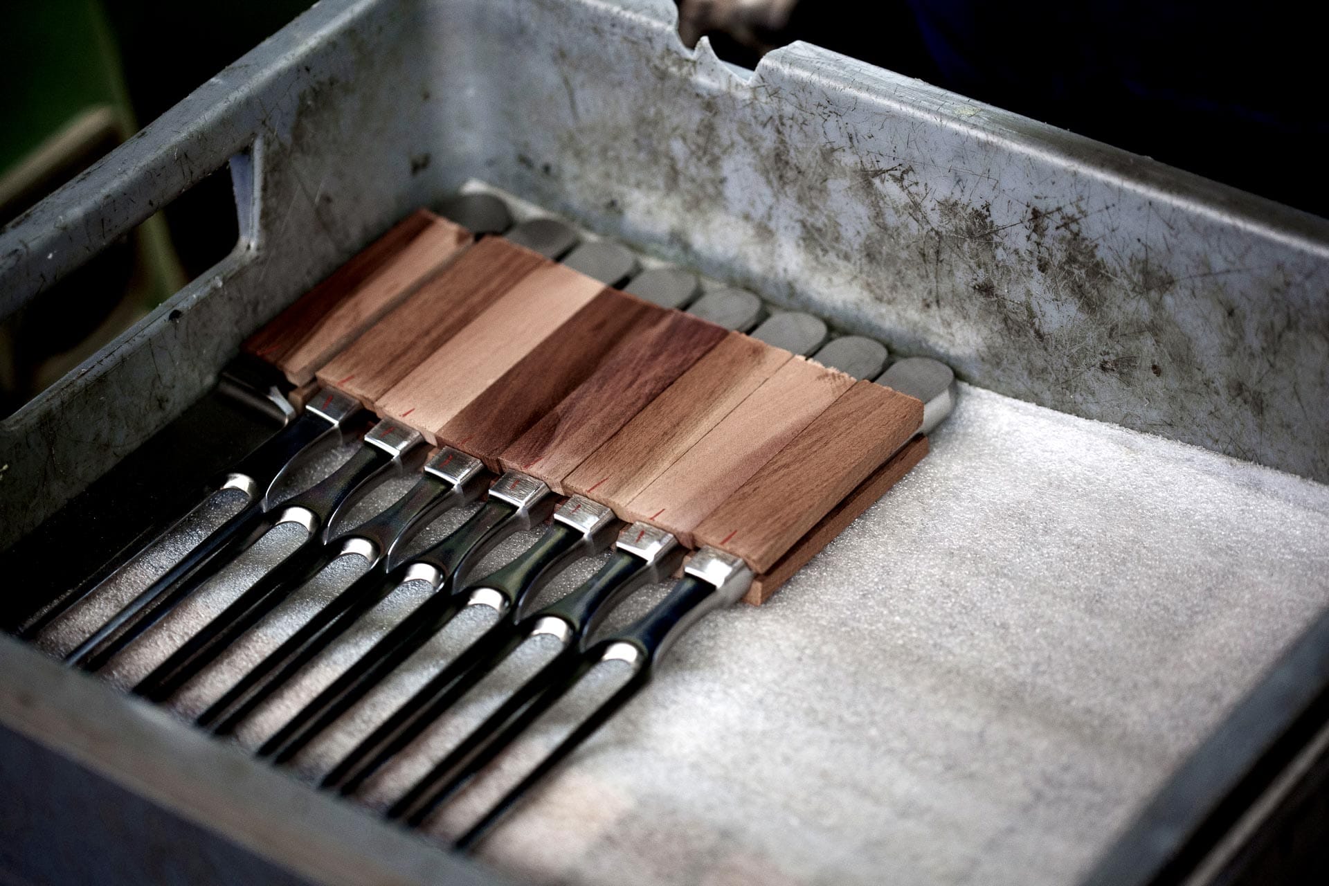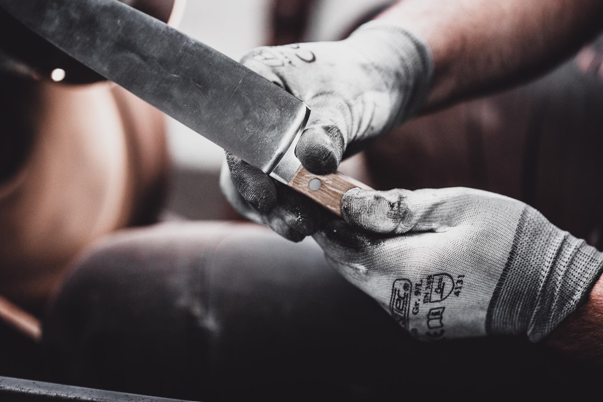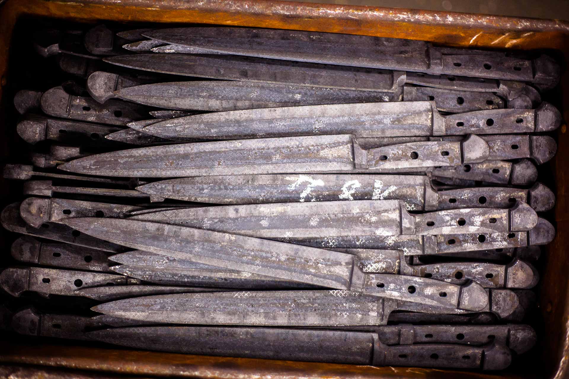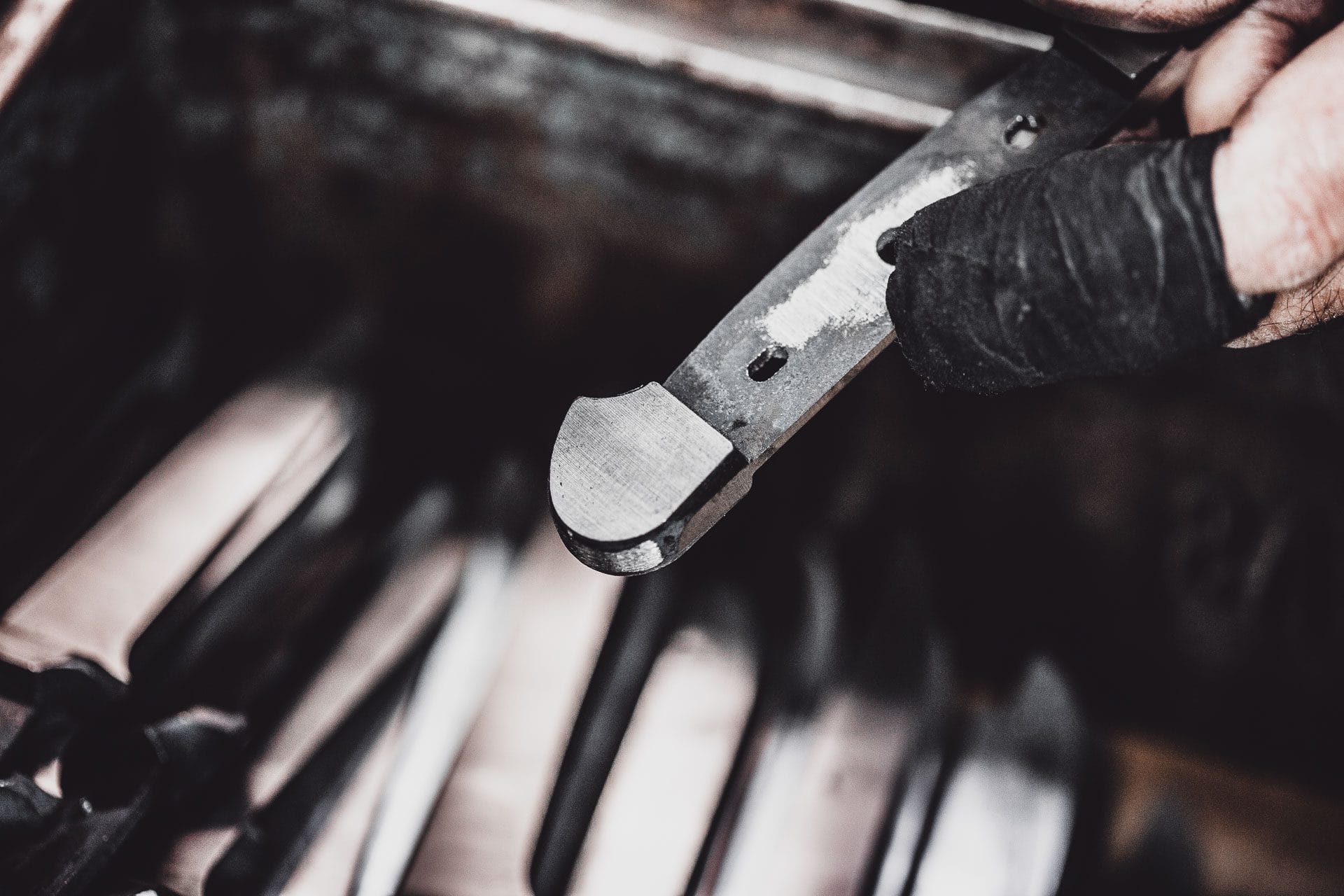 Alles beginnt in der Gesenkschmiede: Aus einem 8 Meter langen Stabstahl (Chrom-, Vanadium-, Molybdänmesserstahl) werden Spaltstücke abgeschnitten. Sie werden bis auf rund 1050 °C erhitzt und mit 3 bis 4 Hammerschlägen im Gesenk geschmiedet. Aus dem Schmiedestück wird schließlich der Messer-Rohling ausgestanzt.