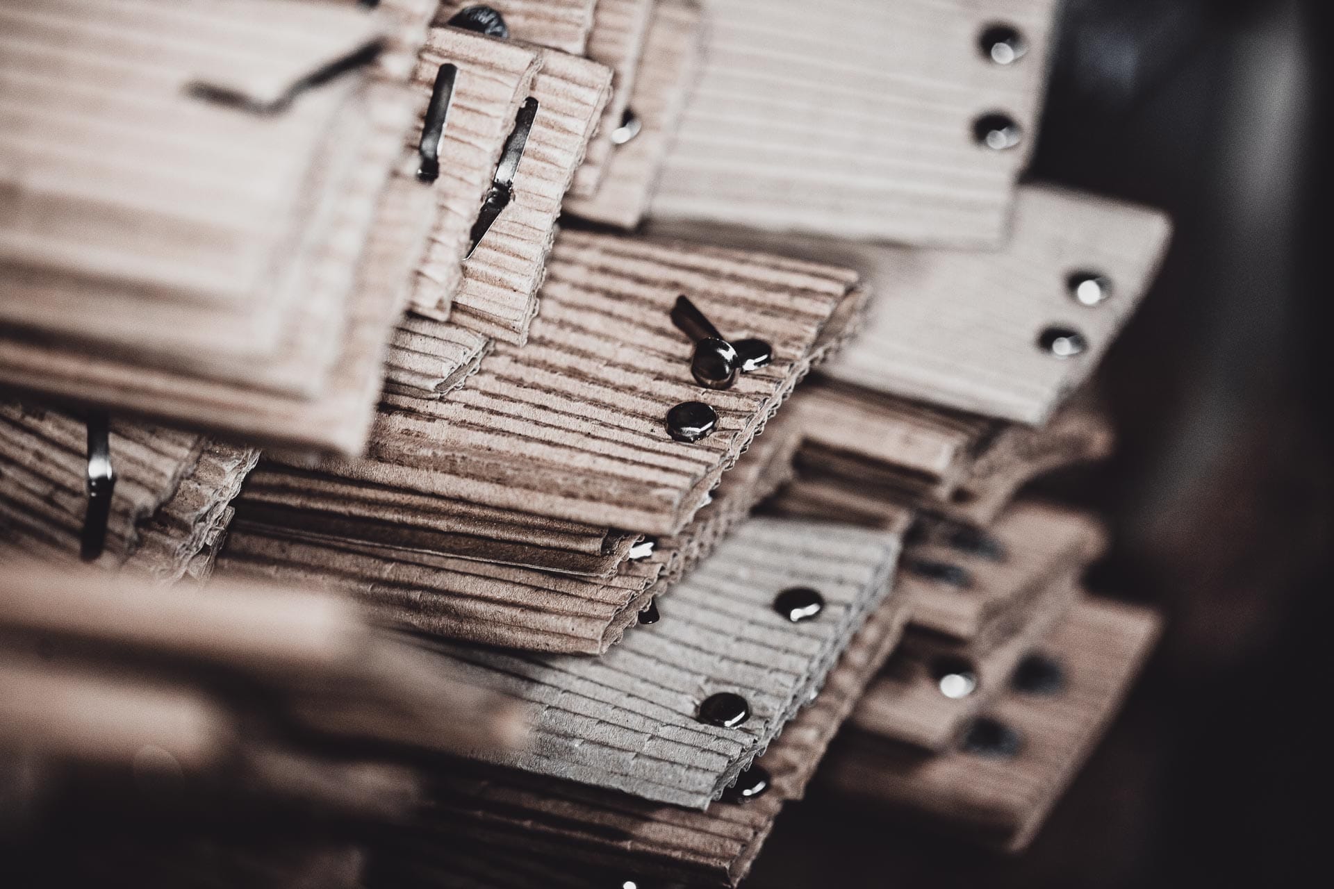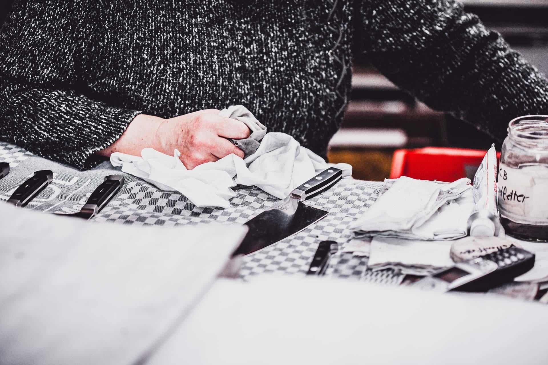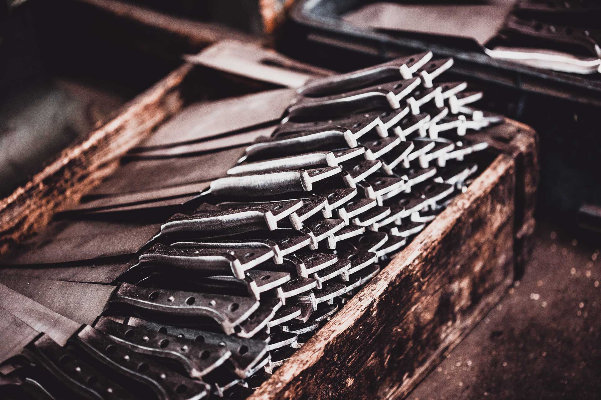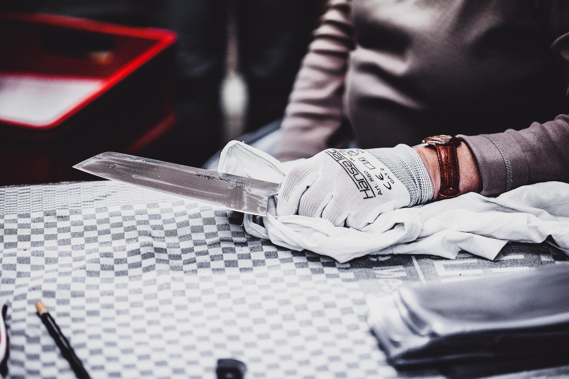 Anschließend werden die Messer gereinigt. Bevor die Messer versandfertig gemacht werden, erfolgt die Qualitätskontrolle. Nach der Qualitätskontrolle bekommen die Messer ihre Schutzhülle. Zum Schluss werden die handgefertigten Versandtaschen mit Nieten und entsprechenden Aufklebern versehen. Dann werden die fertigen Messer für den Versand bereitgelegt.
