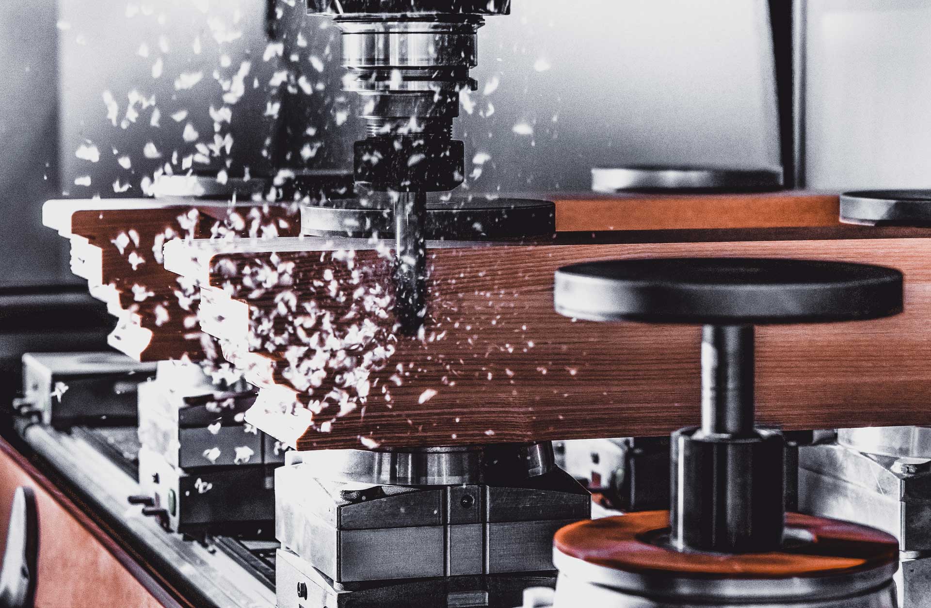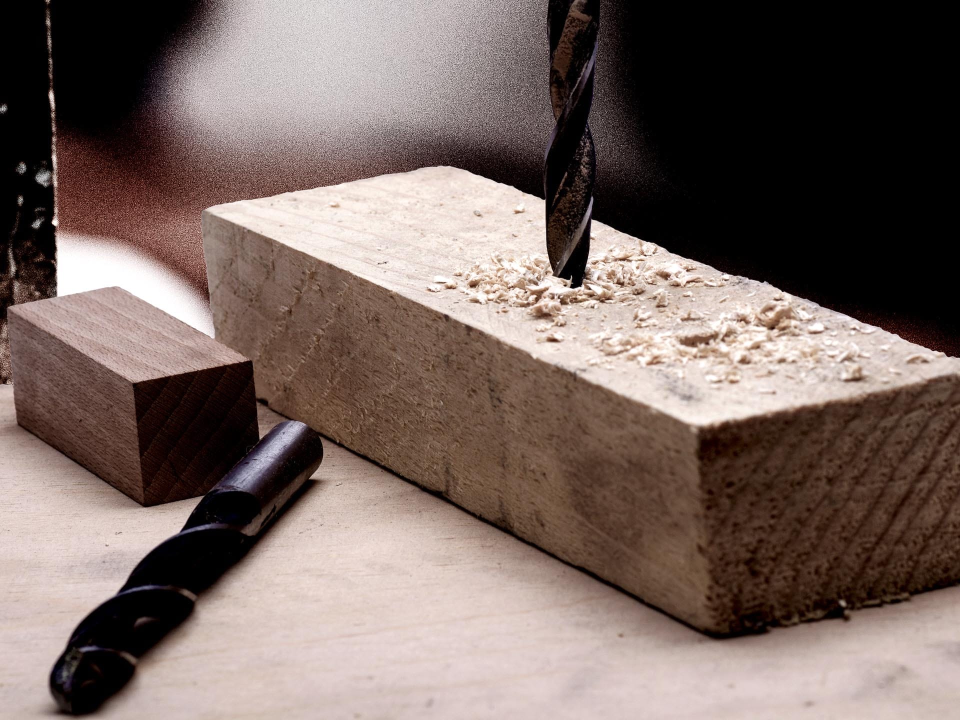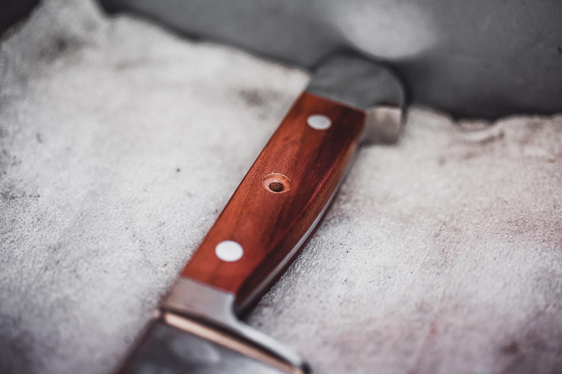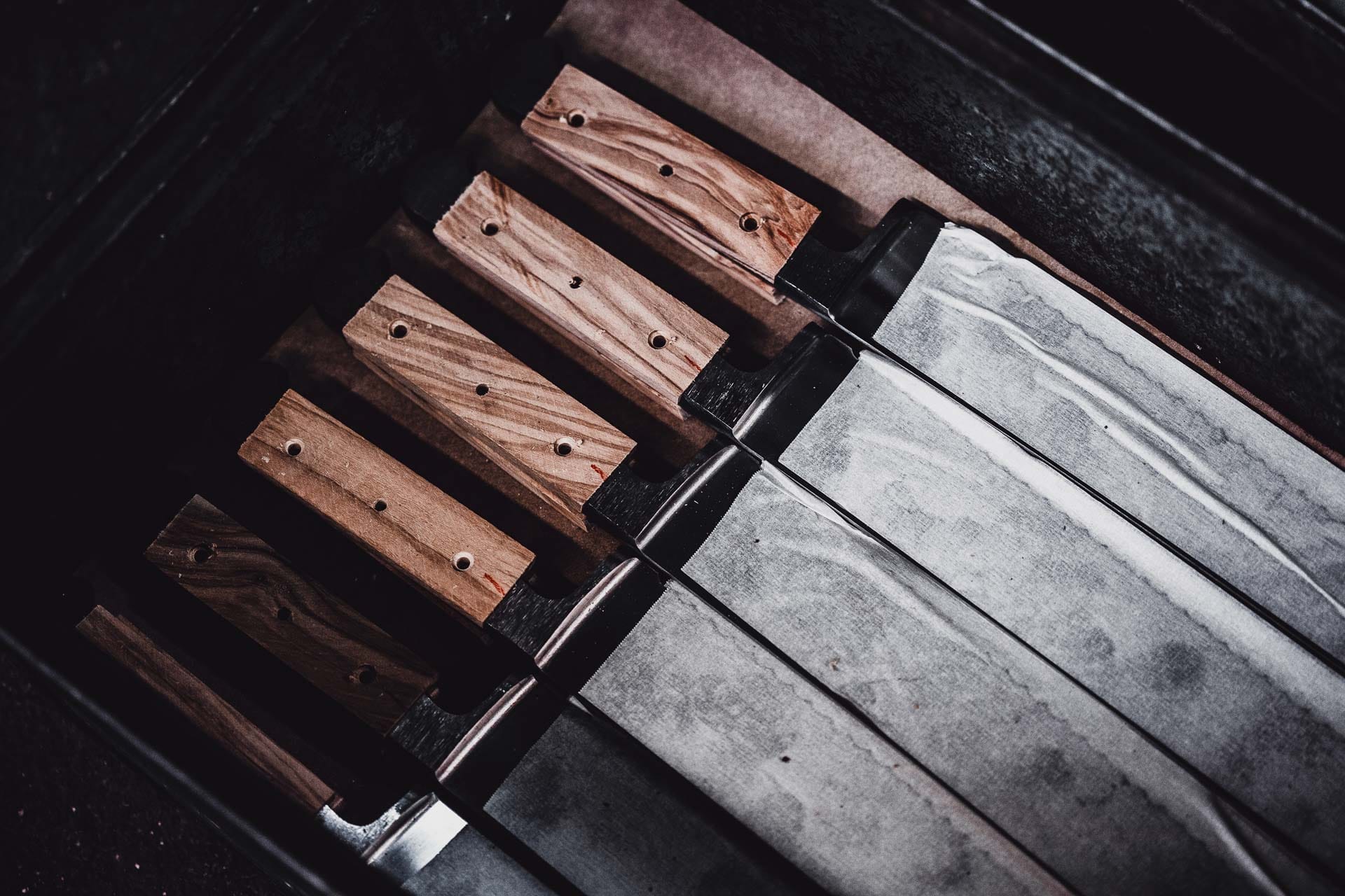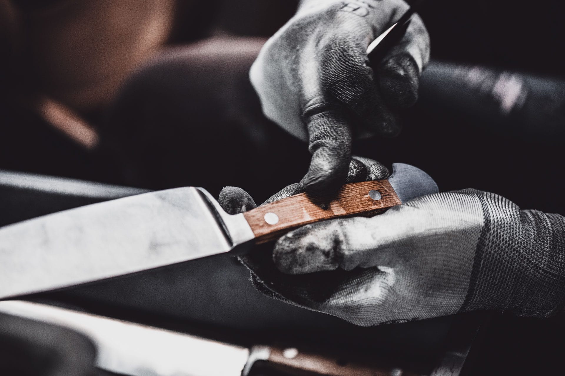 Aus dem Holz werden Kanteln geschnitten und konturgefräst. Die Kanteln werden nun an den Messergriff angepasst. Anschließend werden die Löcher für die Nieten gebohrt. Für die Nietköpfe muss in den Löchern eine Senkung vorgenommen werden. Griffstück und Klinge werden nun durch Nieten verbunden. Mit ca. fünf Arbeitsgängen wird das Holzstück grob an die Klinge beigeschliffen. Diese fünf Arbeitsgänge müssen mit einem feineren Schleifband wiederholt werden.
