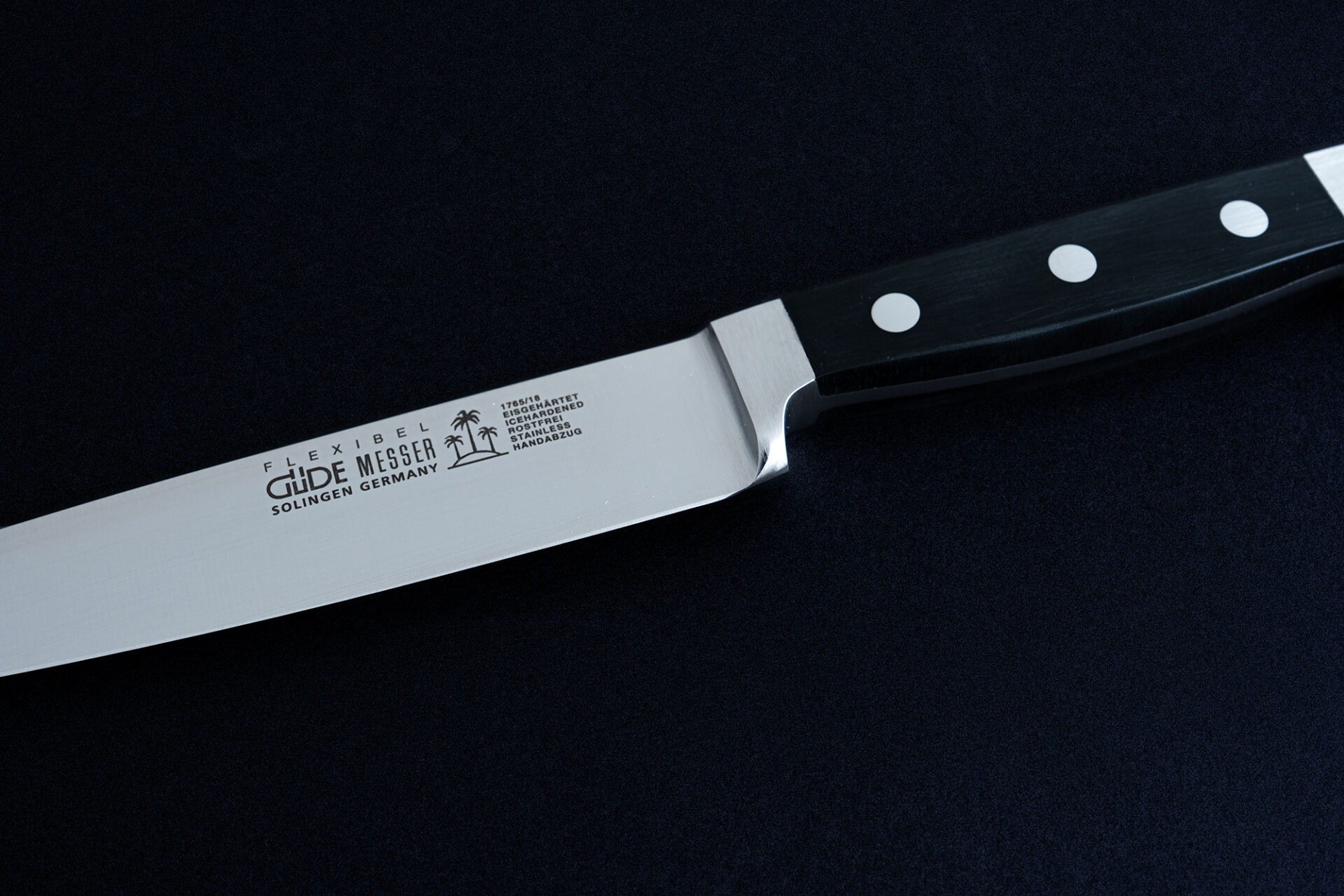 Mit dem Güde-Messer aus der Serie Alpha zaubern Sie im Handumdrehen hauchzarte Filets von Lachs oder Rind, lösen geschickt Haut und Gräten von frischem Fisch und portionieren mühelos zarte Geflügelbrust. Die flexible Klinge folgt jeder Kontur präzise – so gelingen Ihnen auch feine Julienne-Streifen für raffinierte Gemüsegerichte.
