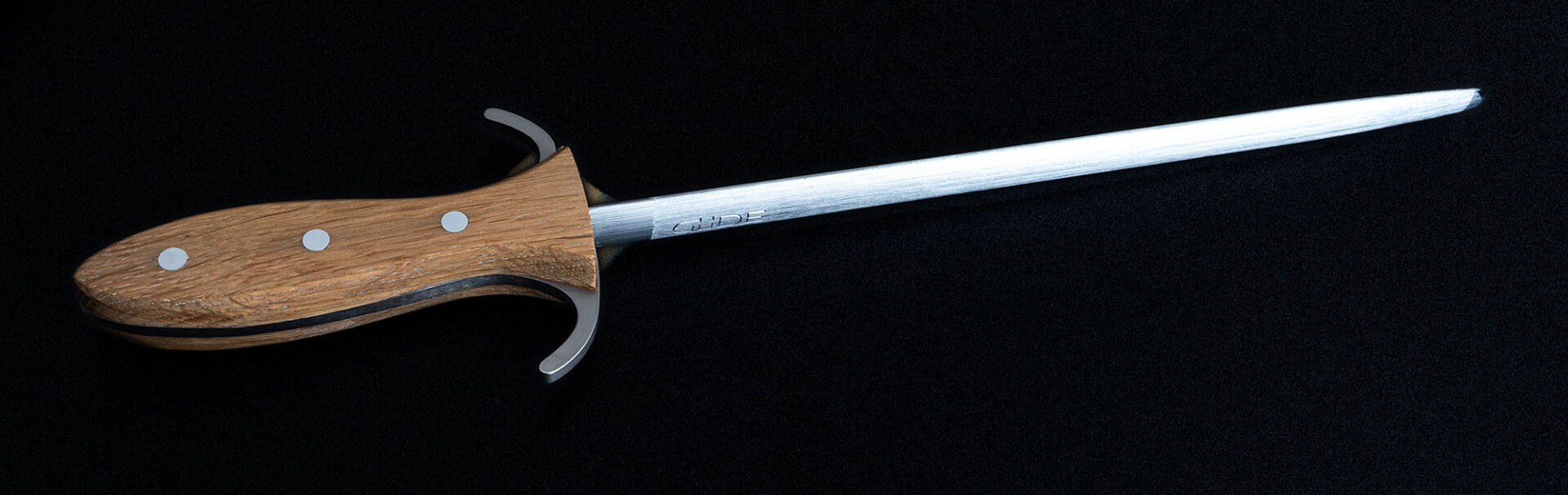 Das besondere Holz des Griffs, gefertigt aus jahrzehntealter Fasseiche, verleiht dem Wetzstahl nicht nur eine einzigartige Optik, sondern auch außergewöhnliche Haltbarkeit – und ist damit ein echtes Statement für nachhaltiges Genusshandwerk.